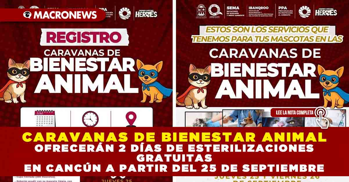 Redacción Macronews.- La Secretaría de Ecología y Medio Ambiente de Quintana Roo ha anunciado una campaña de salud gratuita para mascotas, denominada «Caravanas de Bienestar Animal». El registro para acceder a los servicios de esta iniciativa se llevará a cabo este miércoles, 24 de septiembre, en el Domo Deportivo de la Región 96, en Cancún, en un horario de 2:00 p.m. a 6:00 p.m..