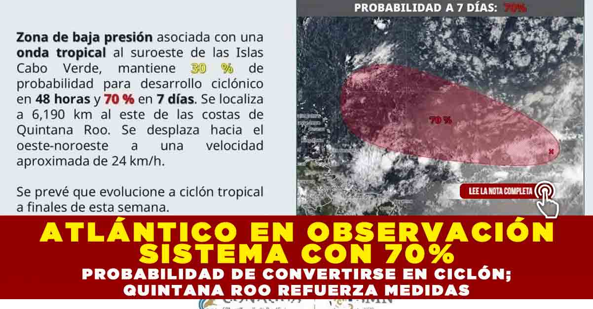 REDACCIÓN MACRONEWS.– La gobernadora Mara Lezama Espinosa ha informado que se mantiene una vigilancia permanente sobre un sistema meteorológico activo en el océano Atlántico, el cual presenta una notable probabilidad de evolucionar a un ciclón en los próximos días. Se trata de una zona de baja presión asociada con una onda tropical al suroeste de las Islas Cabo Verde que mantiene una probabilidad del 30% para desarrollo ciclónico en las próximas 48 horas, incrementando a un significativo 70% en el lapso de 7 días.