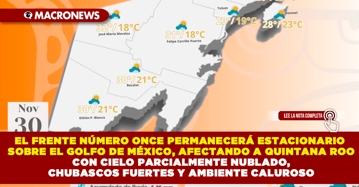 El frente número Once se mantendrá con características de estacionario sobre el Golfo de México al norte de la Península de Yucatán, mantendrá sobre el estado de Quintana Roo cielo parcialmente nubladocon incremento de nublados durante el transcurso del día, intervalos de chubascos con lluvias puntuales fuertes acompañadas de actividad eléctrica, continuará ambiente caluroso durante el día y cálido a templado por la noche y al amanecer. El viento se fijará del norte con rachas de 35 a 45 km/h principalmente sobre las costas del estado.