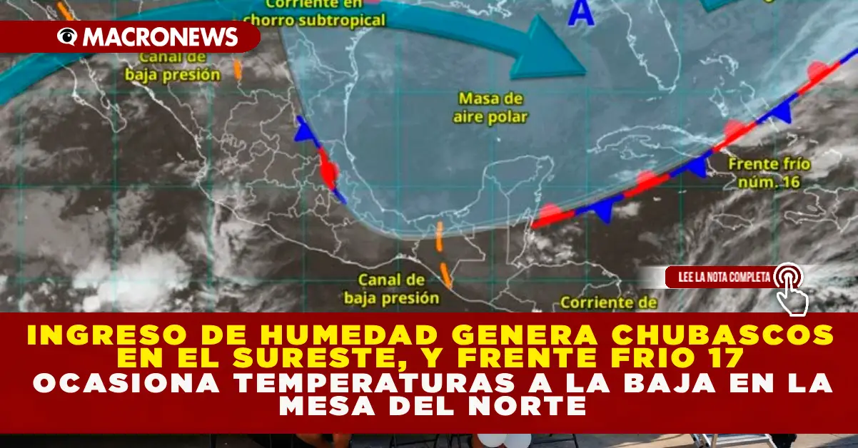 Mientras tanto, el Frente Frío Número 17 se desplazará sobre el norte y noreste del territorio nacional. Este frente, al interactuar con un canal de baja presión en el occidente del Golfo de México y con las corrientes en chorro polar y subtropical, generará lluvias puntuales muy fuertes en Tamaulipas, fuertes en Veracruz y San Luis Potosí, e intervalos de chubascos en Coahuila, Nuevo León, Querétaro, Hidalgo y Puebla.