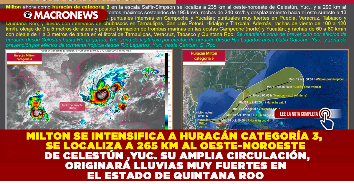 Milton ahora como huracán de categoría 3 en la escala Saffir-Simpson, se localiza a 265 km al oeste-noroeste de Celestún, Yuc., y a 290 km al oeste-noroeste de Progreso, Yuc. Presenta vientos máximos sostenidos de 195 km/h, rachas de 240 km/h y desplazamiento hacia el este-sureste a 13 km/h.