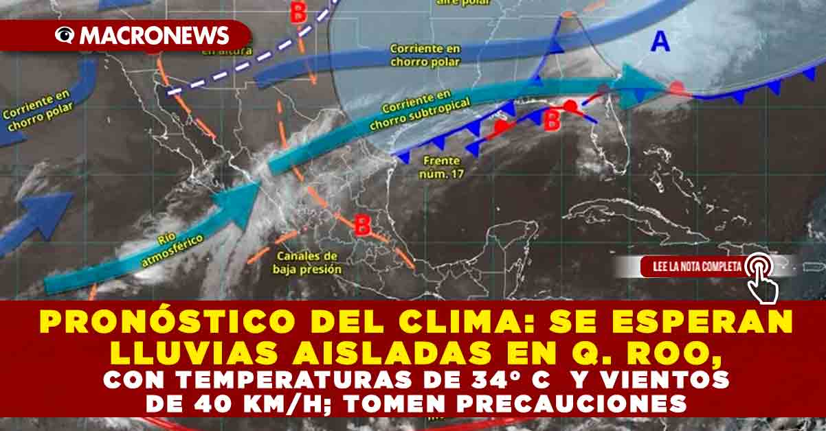 Redacción Macronews.- El estado de Quintana Roo experimentará un día con ambiente caluroso por la tarde y templado a fresco al amanecer, con la afluencia de humedad proveniente del mar Caribe y la influencia del Frente Frío número Diecisiete desplazándose sobre la vertiente del Golfo de México. Las temperaturas máximas pronosticadas oscilarán entre los 30°C y 34°C en la mayor parte de la entidad, mientras que la sensación térmica podría alcanzar los 37°C en Lázaro Cárdenas.