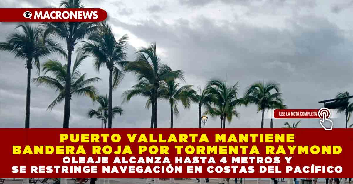Redacción Macronews.- La Unidad de Protección Civil y Bomberos de Puerto Vallarta informó que se mantiene la bandera roja en todas las playas del municipio debido a los efectos de la tormenta tropical Raymond, que ha generado oleaje de entre 3 y 4 metros, vientos sostenidos de 75 km/h y rachas de hasta 95 km/h.