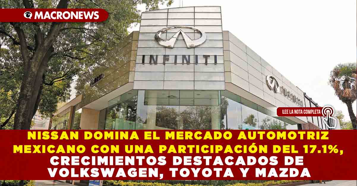 Nissan es la líder de las automotrices en ventas con una participación de mercado de 17.1%; seguido de General Motors con 14%; 11.7% para Grupo Volkswagen; 8.3% para Toyota; 7.2% de KIA y 6.3% de Mazda.