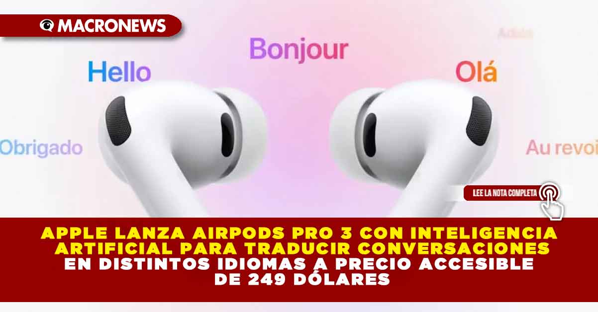 Apple anunció el lanzamiento de los AirPods Pro 3, su nueva generación de auriculares inalámbricos que incorporan innovaciones basadas en inteligencia artificial. Entre sus funciones más destacadas se encuentra la traducción en tiempo real de varios idiomas, una herramienta impulsada por Apple Intelligence con soporte de OpenAI, que busca derribar barreras de comunicación en cualquier parte del mundo.