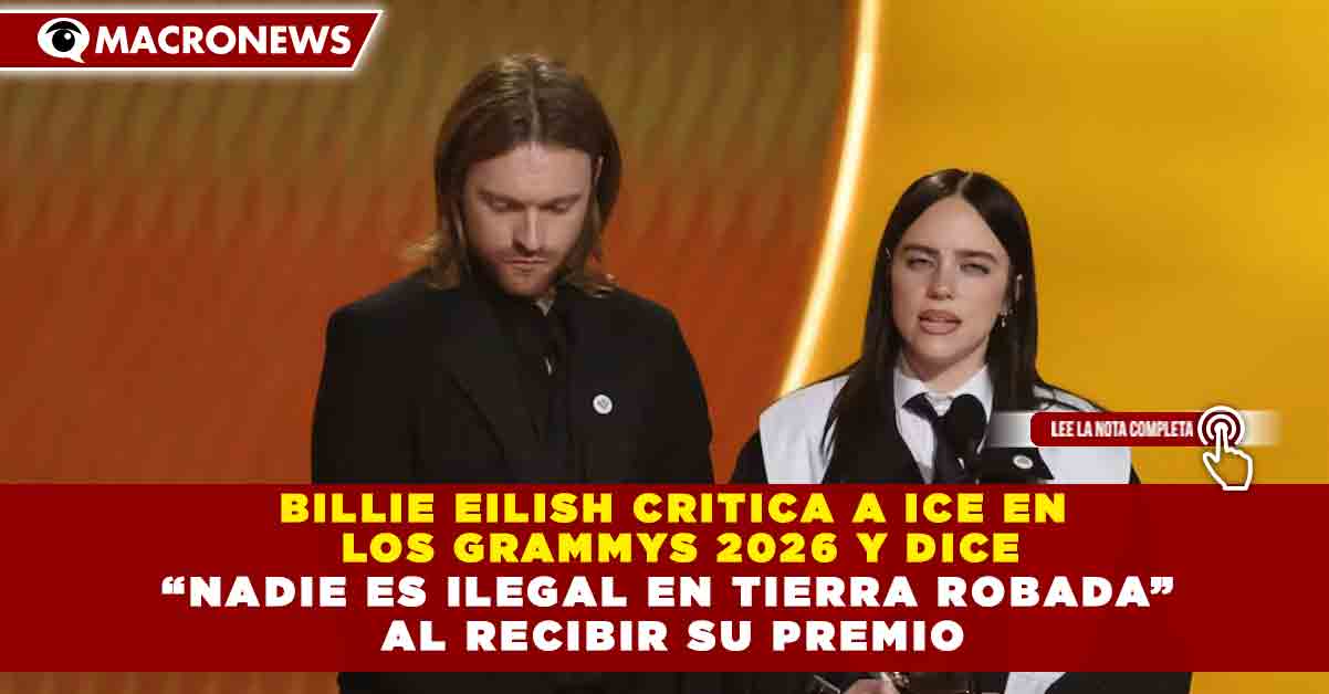Redacción Macronews.- La cantante estadounidense Billie Eilish utilizó su discurso tras ganar el Grammy 2026 a Canción del Año para lanzar una fuerte crítica contra la agencia estadounidense de inmigración (ICE), declarando que “nadie es ilegal en tierra robada” durante la ceremonia celebrada el domingo 1 de febrero de 2026 en Los Ángeles.