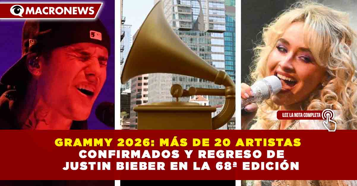 Redacción Macronews.- La 68ª edición de los Premios Grammy 2026, que se celebrará el domingo 1 de febrero, contará con una cartelera musical integrada por más de 20 artistas confirmados, entre los que destaca el regreso de Justin Bieber al escenario de la Academia de la Grabación, marcando uno de los momentos más esperados de la noche.