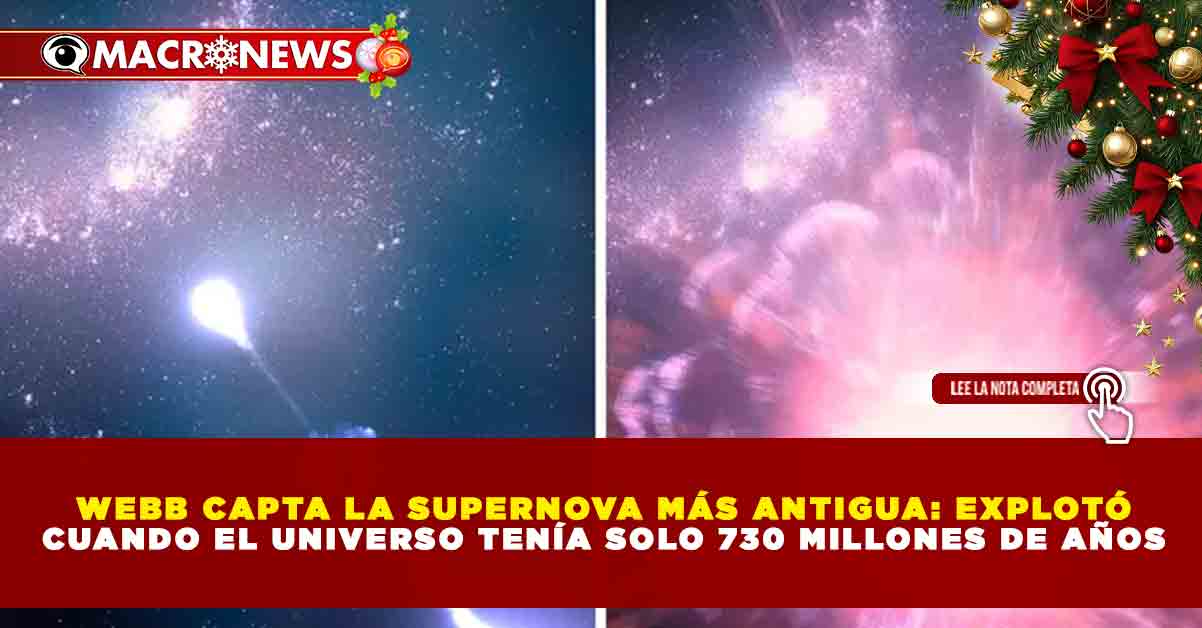Redacción Macronews.- El Telescopio Espacial James Webb (JWST) volvió a marcar un hito en la astronomía al observar la supernova más antigua registrada hasta ahora, una explosión estelar que ocurrió cuando el universo tenía apenas 730 millones de años, equivalente a solo el 5% de su edad actual, superando ampliamente el récord previo de 1.800 millones de años.