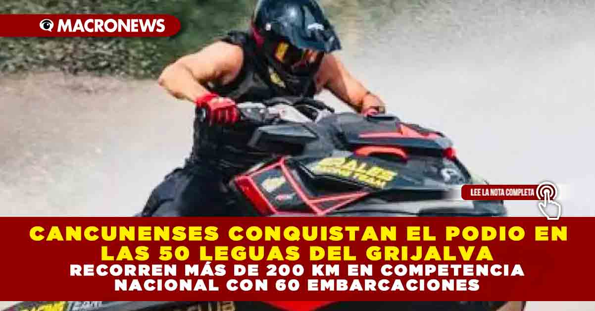 Redacción Macronews.- El Nautic Racing Club de Cancún logró una participación histórica en la tradicional Carrera 50 Leguas del Grijalva, celebrada recientemente en Villahermosa y Frontera, Tabasco, donde más de 60 embarcaciones compitieron en un circuito de más de 200 kilómetros sobre el Río Grijalva. Los pilotos Roberto Erales y Eduardo Cabrera colocaron el nombre de Quintana Roo en lo más alto del podio, al coronarse campeones en las categorías MAX y Challenger, respectivamente.
