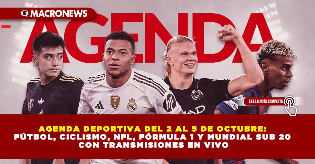 AGENDA DEPORTIVA DEL 2 AL 5 DE OCTUBRE: FÚTBOL, CICLISMO, NFL, FÓRMULA 1 Y MUNDIAL SUB 20 CON TRANSMISIONES EN VIVO
