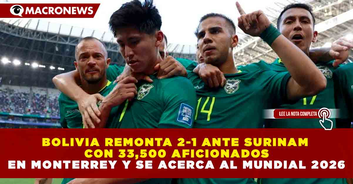 Redacción Macronews.- La selección de Bolivia dio un paso firme rumbo a la Copa del Mundo 2026 tras vencer 2-1 a Surinam en un emocionante partido de repechaje disputado en Monterrey, donde se registró una asistencia de 33 mil 500 aficionados.