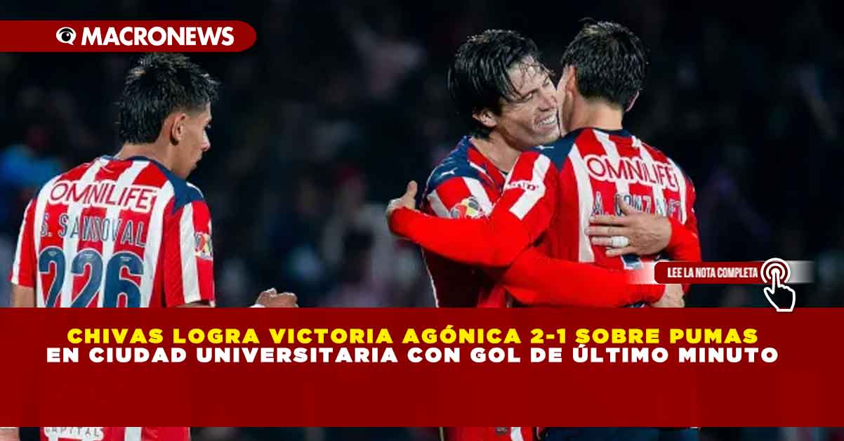 Chivas logró un triunfo agónico 2-1 sobre Pumas en Ciudad Universitaria, en un partido lleno de tensión, errores y emociones hasta el último minuto. El equipo de Gabriel Milito encadenó su tercera victoria consecutiva en el Apertura 2025, gracias al gol de Daniel Aguirre en el 90’ y al penal fallado por Álvaro Angulo en el 90+7, que selló el resultado. En un duelo que comenzó con dominio alternado, Pumas pegó primero con tanto de Pedro Vite, pero los tapatíos respondieron con fuerza para quedarse con tres puntos de oro.