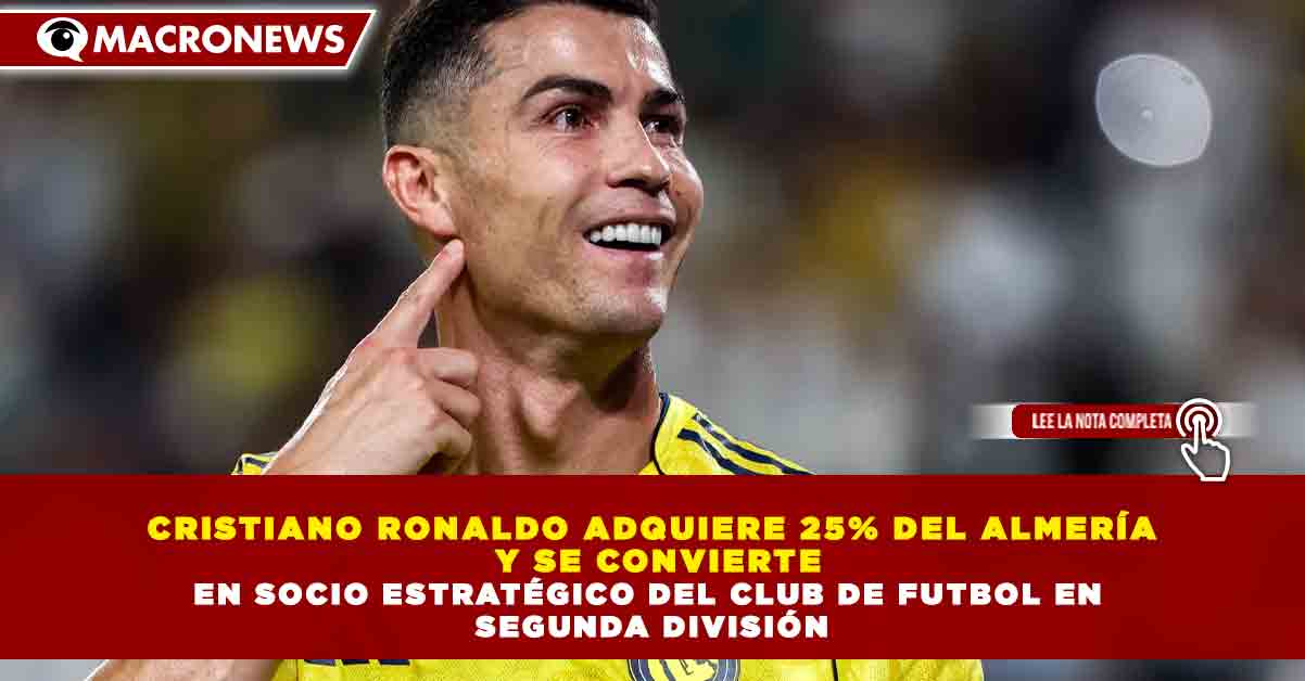 Redacción Macronews.- El futbolista portugués Cristiano Ronaldo anunció la adquisición del 25% de la Unión Deportiva Almería, equipo que actualmente ocupa el tercer lugar en la tabla de LaLiga Hypermotion. La operación se realizó a través de CR7 Sports Investments, nueva filial de su empresa CR7 SA, consolidando así su incursión en la propiedad de clubes profesionales.