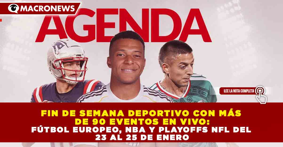 Redacción Macronews.- Del viernes 23 al domingo 25 de enero, la agenda deportiva estará marcada por más de 90 eventos en vivo entre fútbol internacional, básquetbol de la NBA y playoffs de la NFL, con transmisiones a través de cadenas como Sky Sports, ESPN, FOX, HBO Max, Canal 5 y NBA League Pass.