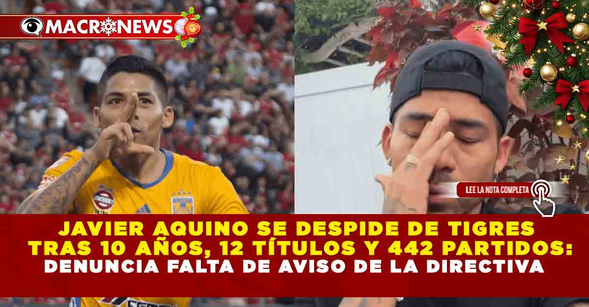 Redacción Macronews.- El fin de una era en San Nicolás se confirmó este sábado luego de que Javier Aquino anunciara su salida de los Tigres de la UANL tras una década en la institución, periodo en el que conquistó 12 títulos y disputó 442 partidos oficiales. La despedida, sin embargo, estuvo marcada por la polémica, luego de que el futbolista publicara un video de 28 minutos en redes sociales en el que denunció un manejo inadecuado por parte de la directiva, especialmente tras la final perdida ante Toluca el pasado fin de semana.