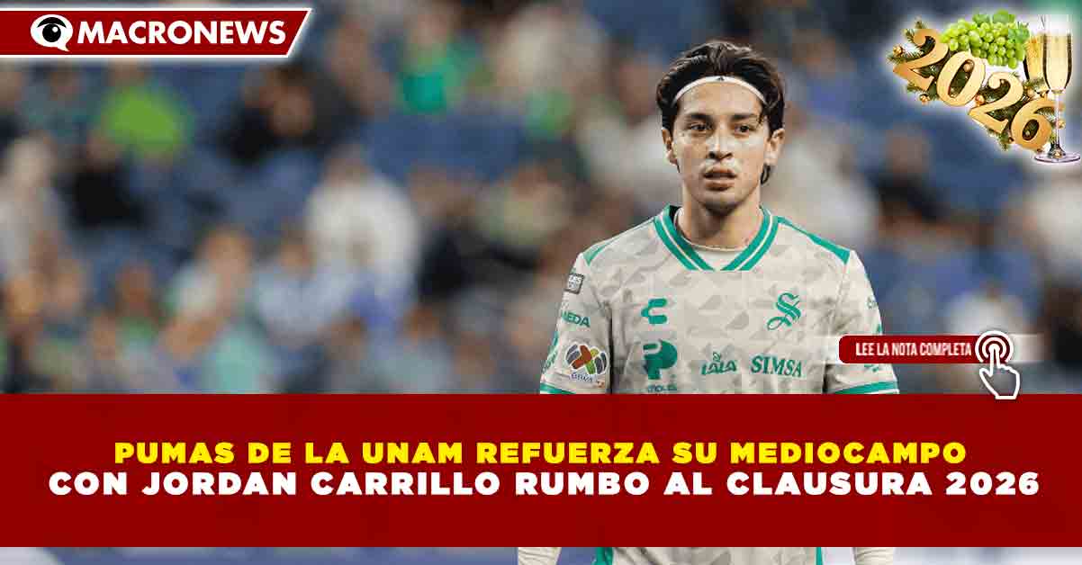 Redacción Macronews.- Los Pumas de la UNAM continúan con los ajustes a su plantilla de cara al torneo Clausura 2026 y este viernes 26 de diciembre anunciaron, como regalo navideño para su afición, la incorporación del mediocampista mexicano Jordan Carrillo, quien llega procedente del Club Santos Laguna para fortalecer el mediocampo universitario.
