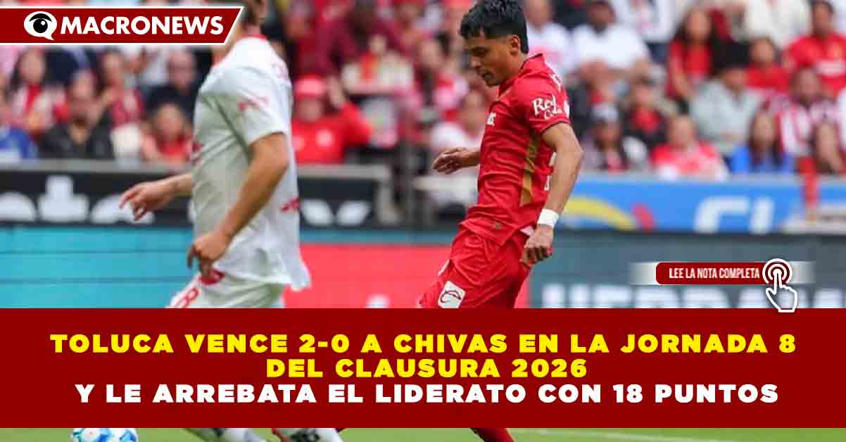 Redacción Macronews.- El bicampeón del futbol mexicano, Deportivo Toluca Fútbol Club, derrotó 2-0 a Club Deportivo Guadalajara este sábado en duelo correspondiente a la Jornada 8 del Torneo Clausura 2026 de la Liga MX, disputado en el Estadio Nemesio Diez. Con el resultado, los Diablos Rojos llegaron a 18 puntos y desplazaron provisionalmente al Rebaño de la cima de la tabla.