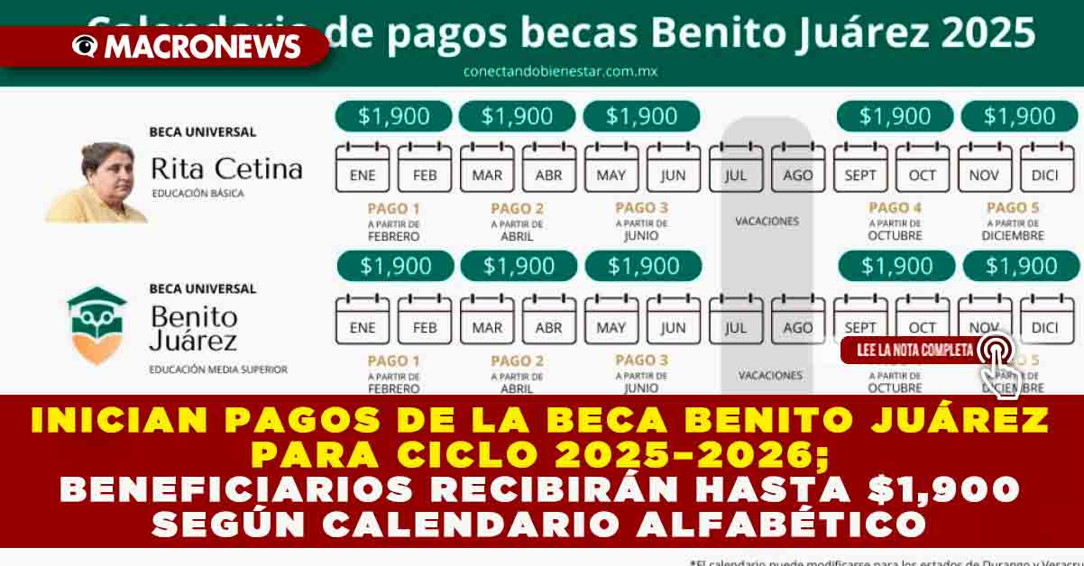 Redacción Macronews.- La Coordinación Nacional de Becas para el Bienestar Benito Juárez inició este lunes 20 de octubre el proceso de pagos correspondiente al primer bimestre del ciclo escolar 2025–2026 (septiembre–octubre), dirigido a estudiantes de continuidad en nivel medio superior. Los depósitos, de hasta $1,900 pesos por beneficiario, se realizan de forma escalonada conforme a la letra inicial del primer apellido del titular de la tarjeta del Banco del Bienestar.