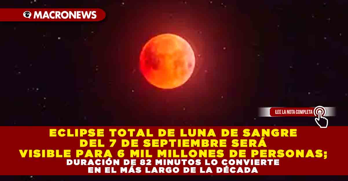 - Eclipse total de luna de sangre del 7 de septiembre será visible para 6 mil millones de personas; duración de 82 minutos lo convierte en el más largo de la década