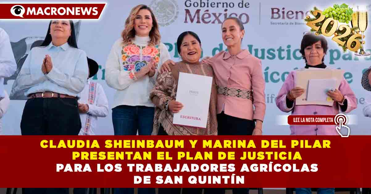 Redacción Macronews.- La presidenta de México, Claudia Sheinbaum, junto con la gobernadora de Baja California, Marina del Pilar Ávila, presentó este 31 de enero de 2026 el Plan de Justicia para los Trabajadores Agrícolas de San Quintín, un conjunto de acciones integrales que buscan mejorar las condiciones de vida y laborales de la población jornalera de la región.