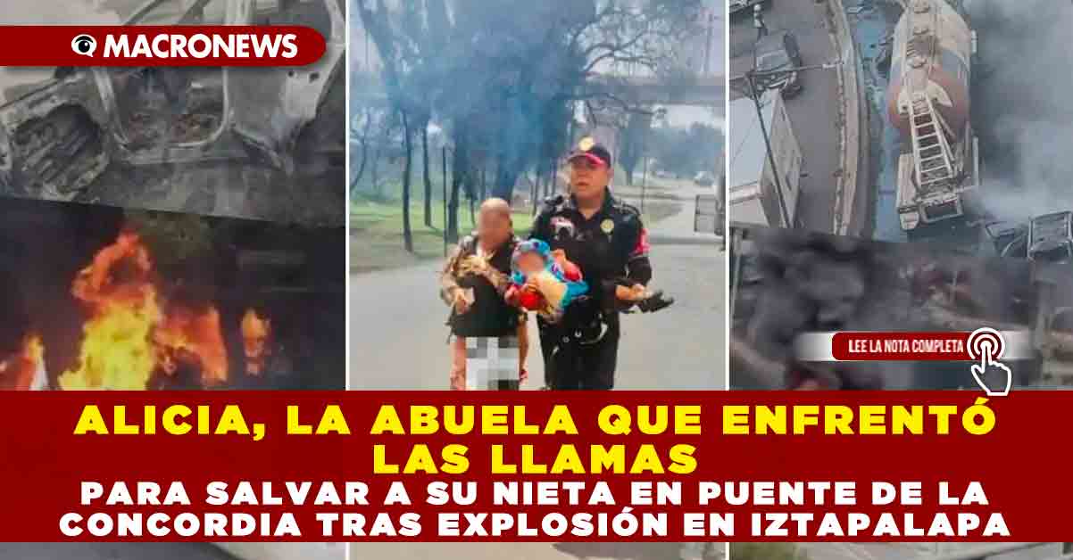 REDACCIÓN MACRONEWS.- En un acto heroico ocurrido durante la explosión de una pipa de gas en el Puente de la Concordia, Iztapalapa, Alicia Matías Teodoro, de 54 años, sufrió quemaduras en el 90% de su cuerpo al proteger con su propio cuerpo a su nieta de apenas dos años, Jazmín, quien quedó a salvo gracias a la valentía de su abuela y la rápida intervención de un policía del lugar.