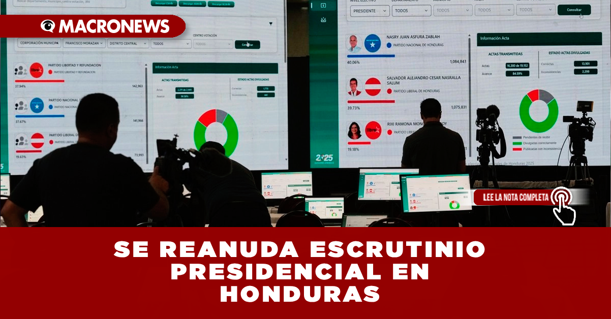 TEGUCIGALPA, HONDURAS. El escrutinio de las elecciones presidenciales de Honduras se reanudó este lunes, después de permanecer detenido durante tres días. Con la actualización de los resultados, el candidato del conservador Partido Nacional, Nasry Asfura, mantiene una estrecha ventaja de poco menos de 20 mil votos sobre el contendiente del centrista Partido Liberal, Salvador Nasralla.