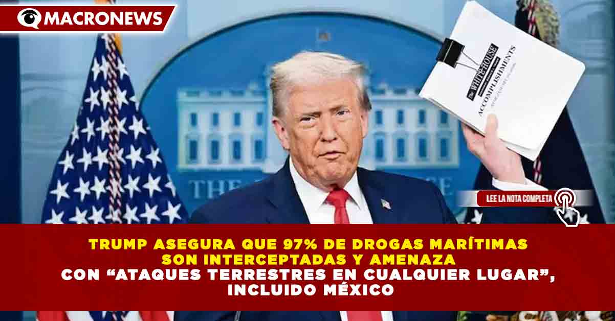 Redacción Macronews.- El presidente de Estados Unidos, Donald Trump, afirmó que su administración ha interceptado el 97 % de las drogas transportadas por vía marítima y advirtió que está dispuesto a lanzar ataques terrestres contra cárteles de la droga “en cualquier lugar”, incluidos México, Centroamérica y Sudamérica, durante una entrevista exclusiva con New York Post desde la Oficina Oval.