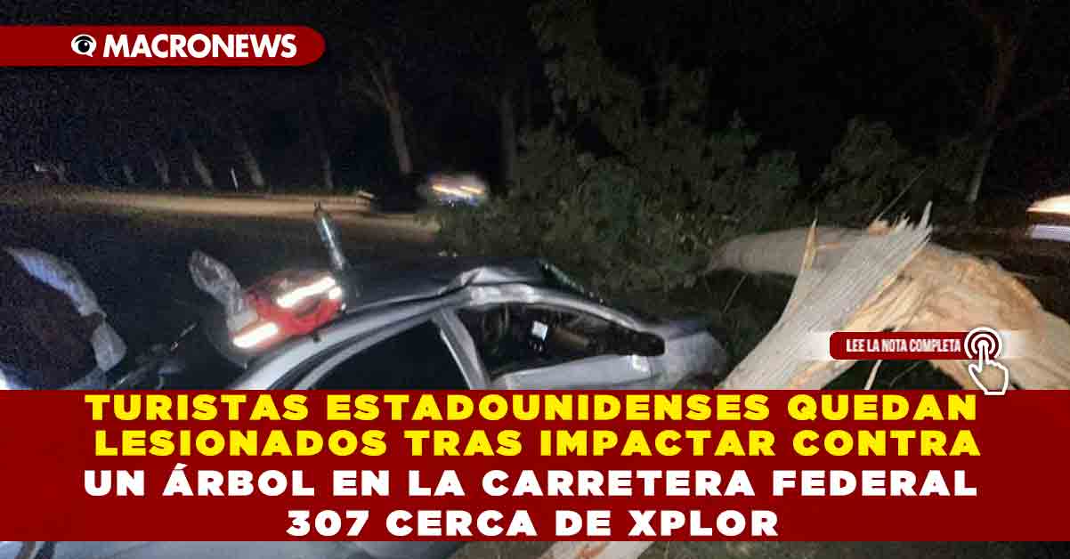 Playa del Carmen, a 17 de noviembre de 2025.- Una pareja de turistas de origen estadounidense protagonizó en la noche de ayer lunes un aparatoso accidente al impactarse, a bordo de un vehículo, contra un árbol en el camellón central de la Carretera Federal 307, a la altura del parque Xplor, al sur de Playa del Carmen.