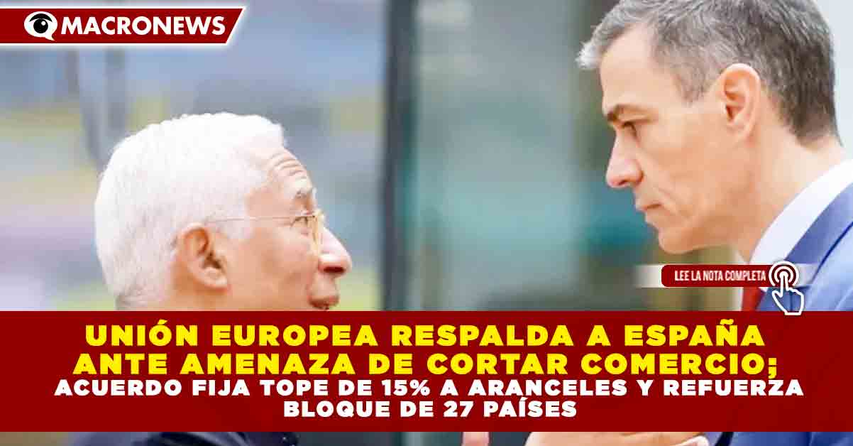 Redacción Macronews.- La Unión Europea cerró filas en apoyo a España luego de que el presidente de Estados Unidos, Donald Trump, sugiriera la posibilidad de cortar el comercio bilateral por la postura del Gobierno español frente al conflicto en Oriente Medio. El acuerdo comercial vigente entre ambas partes establece un tope del 15% a los aranceles generales estadounidenses sobre productos europeos.