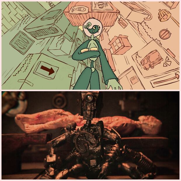 V1-Truvius es un robot en stop motion que, como un Frankenstein a la inversa, intenta unir con hilo distintas partes humanas, para armar a su creador; Selah, en tanto, es un pez en animación 2D en un traje tecnológico, que trata por todos los medios llevarle sopa a una ratita que habita en un basurero.