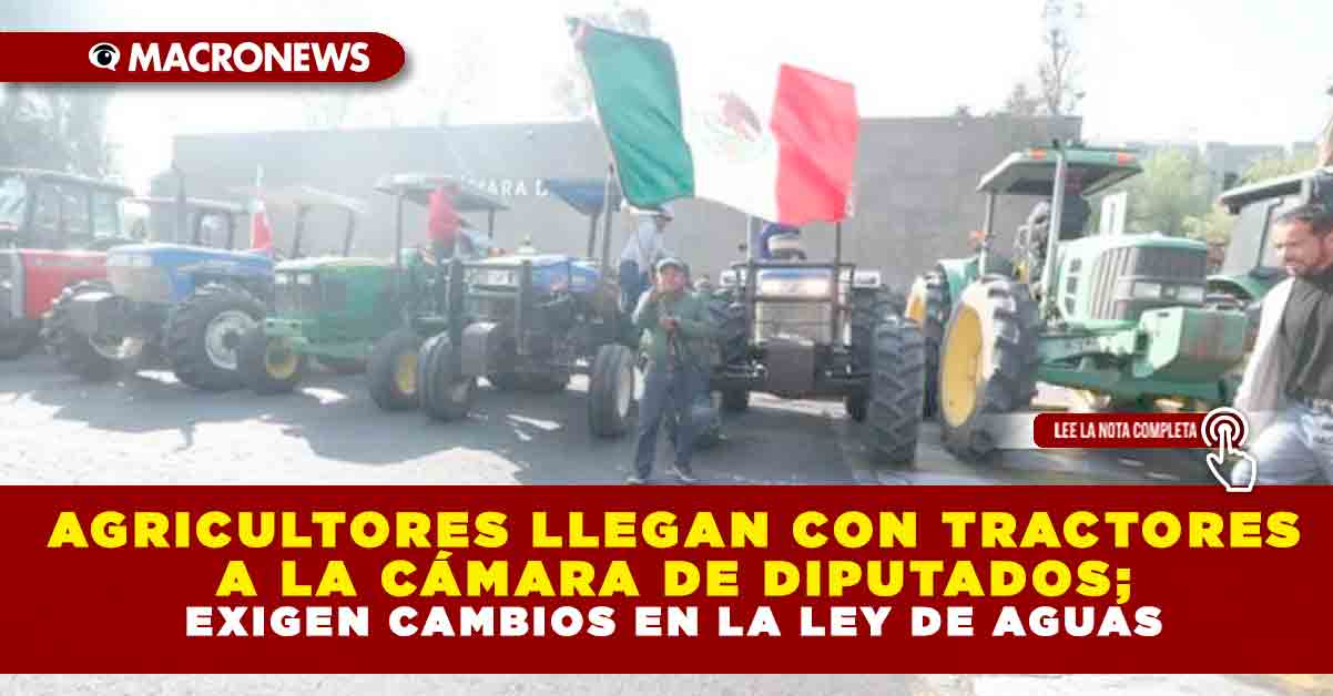 Redacción Macronews.- Cientos de agricultores y campesinos se manifestaron este miércoles en la Cámara de Diputados, donde entregaron un pliego petitorio a la Comisión de Recursos Hidráulicos, Agua Potable y Saneamiento, en rechazo al dictamen de la nueva Ley de Aguas. Los inconformes arribaron con decenas de tractores que estacionaron frente a la puerta cuatro del recinto legislativo, portando banderas y pancartas mientras entonaban el Himno Nacional.