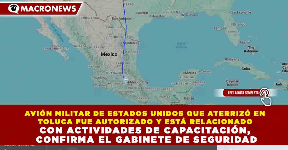 Redacción Macronews.- Tras el aterrizaje de una aeronave militar Lockheed Martin C-130J-30 Súper Hércules en el Aeropuerto Internacional de Toluca (AIT), el Gabinete de Seguridad informó que su presencia en territorio nacional correspondió a un vuelo autorizado por autoridades mexicanas, vinculado a actividades de capacitación, y realizado bajo los protocolos y acuerdos de colaboración bilateral entre México y Estados Unidos.