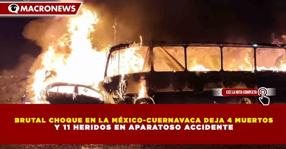 Redacción Macronews.- Un fuerte accidente vial registrado en la autopista México-Cuernavaca dejó un saldo preliminar de 4 personas fallecidas y 11 lesionadas, luego de un choque de alto impacto ocurrido en uno de los tramos más transitados de esta vía federal, lo que provocó una intensa movilización de cuerpos de emergencia y el cierre parcial de la circulación.
