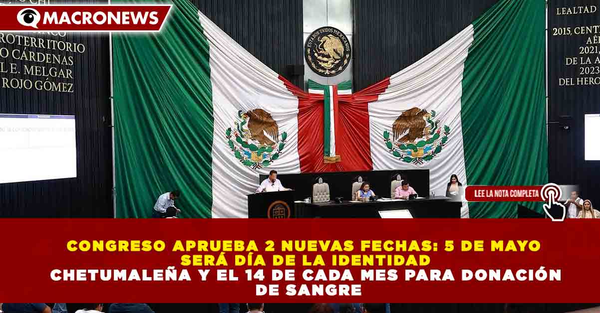 Redacción Macronews.- La Congreso del Estado de Quintana Roo aprobó por unanimidad declarar el 5 de mayo como el “Día de la Identidad Chetumaleña”, además de instituir el 14 de cada mes como el “Día Estatal de la Donación Voluntaria de Sangre”, con el objetivo de fortalecer la cultura, la identidad local y la responsabilidad social en la entidad.