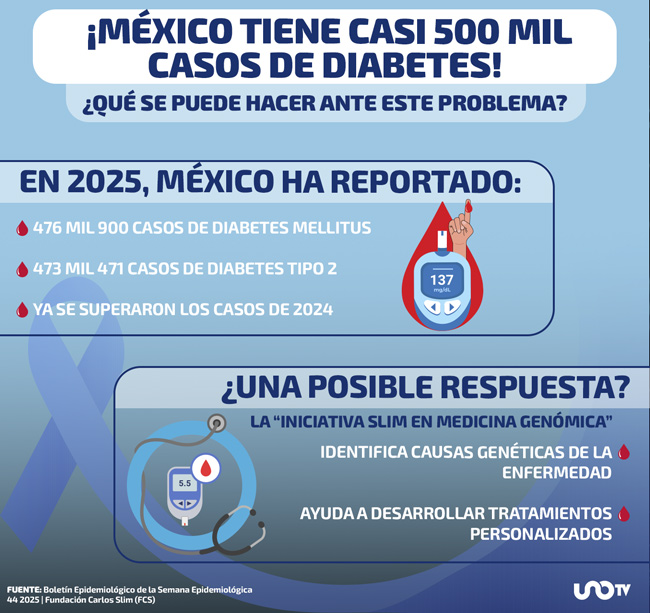 Hasta la Semana Epidemiológica 44 de 2025, México registró 476 mil 900 casos de diabetes mellitus, cifra que ya supera todos los reportados en 2024 (431 mil 370), según el Boletín Epidemiológico de la Secretaría de Salud.