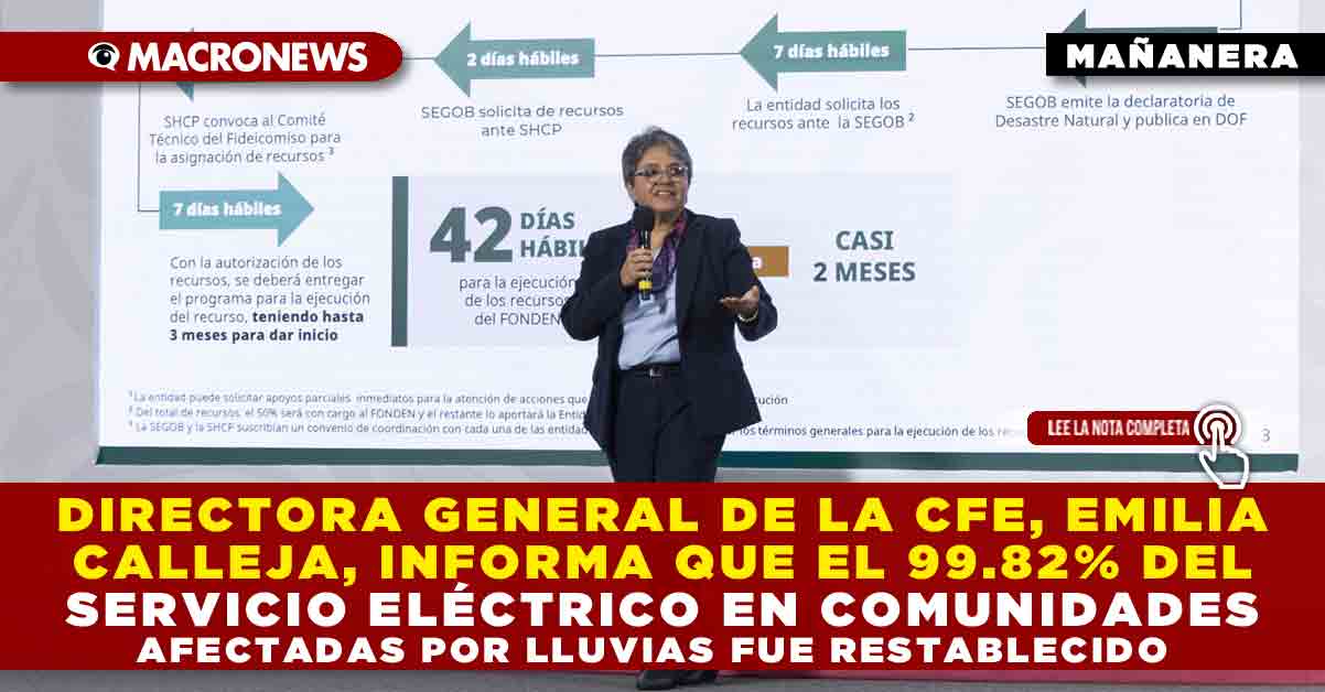 Redacción Macronews.- La Comisión Federal de Electricidad (CFE) ha logrado restablecer el 99.82% del suministro eléctrico en las comunidades afectadas por las intensas lluvias e inundaciones que azotaron diversas regiones del país hace dos semanas.