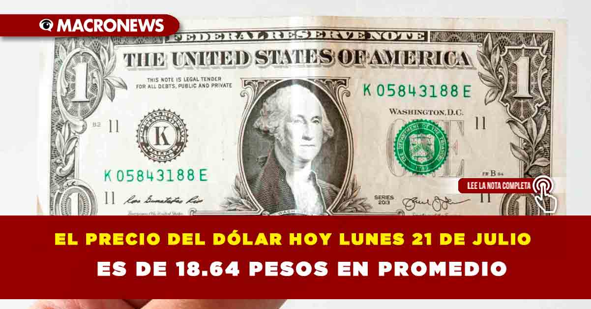 El tipo de cambio para pagar las obligaciones en dólares estadounidenses quedó para este lunes 21 de julio, según Banxico, en 18.64 pesos por cada divisa verde.