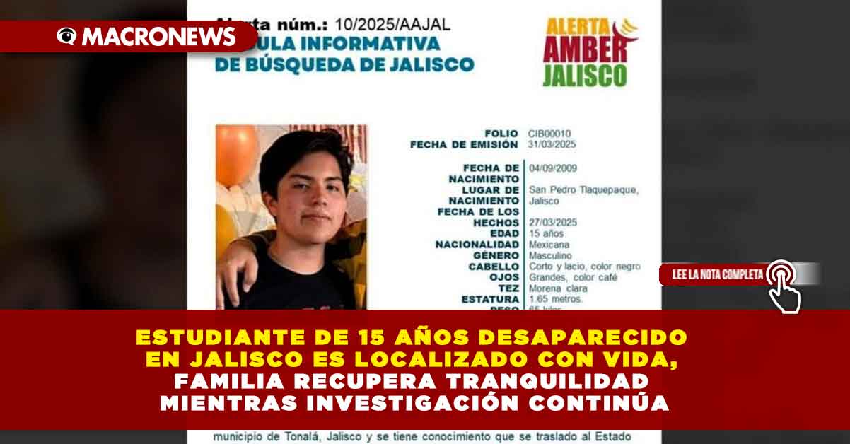 ESTUDIANTE DE 15 AÑOS DESAPARECIDO EN JALISCO ES LOCALIZADO CON VIDA, FAMILIA RECUPERA TRANQUILIDAD MIENTRAS INVESTIGACIÓN CONTINÚA
