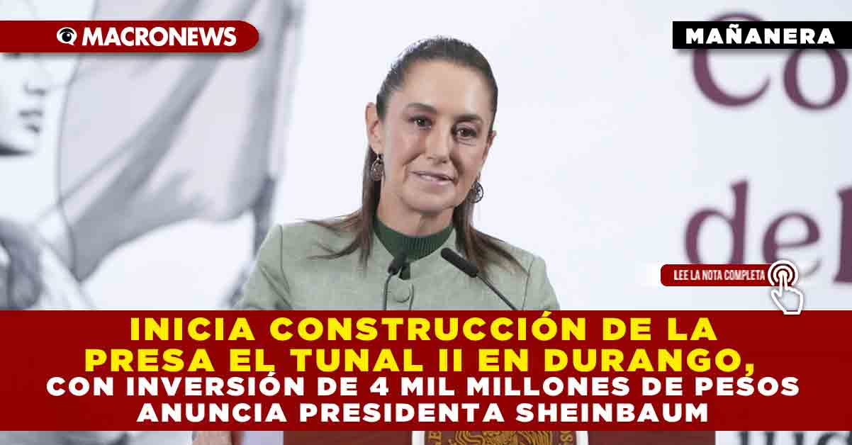 Redacción Macronews.- La presidenta de México, Claudia Sheinbaum, encabezó este martes el banderazo de inicio de la construcción de la Presa El Tunal II, en Durango. La obra, que representa una inversión federal de aproximadamente 4 mil millones de pesos, garantizará el abasto de agua potable a más de 300 mil habitantes del estado durante los próximos 50 años. La ceremonia se realizó de manera virtual desde el Ejido El Nayar, en el municipio de Durango, y contó con la participación del director de la Comisión Nacional del Agua (Conagua), Efraín Morales, y el gobernador del estado, Esteban Villegas.
