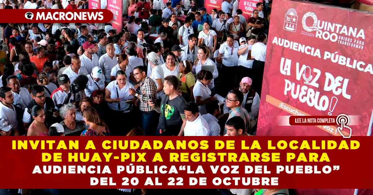 Redacción Macronews.- Con el objetivo de fortalecer la participación ciudadana y escuchar directamente las inquietudes de la población, autoridades locales convocan a los habitantes de Huay-Pix y zonas aledañas a registrarse para la audiencia pública “La Voz del Pueblo”, que se llevará a cabo del 20 al 22 de octubre de 2025.