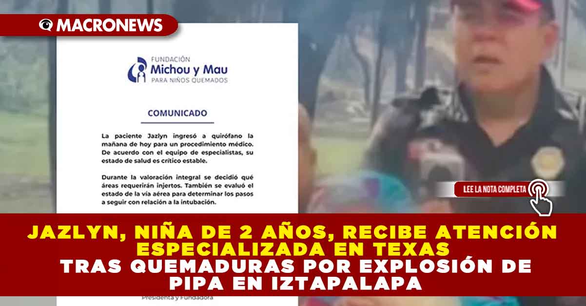 La Fundación Michou y Mau informó que Jazlyn, de 2 años, fue trasladada a Galveston, Texas, para recibir atención médica especializada tras sufrir quemaduras graves de tercer grado en la explosión de una pipa de gas en Iztapalapa.
