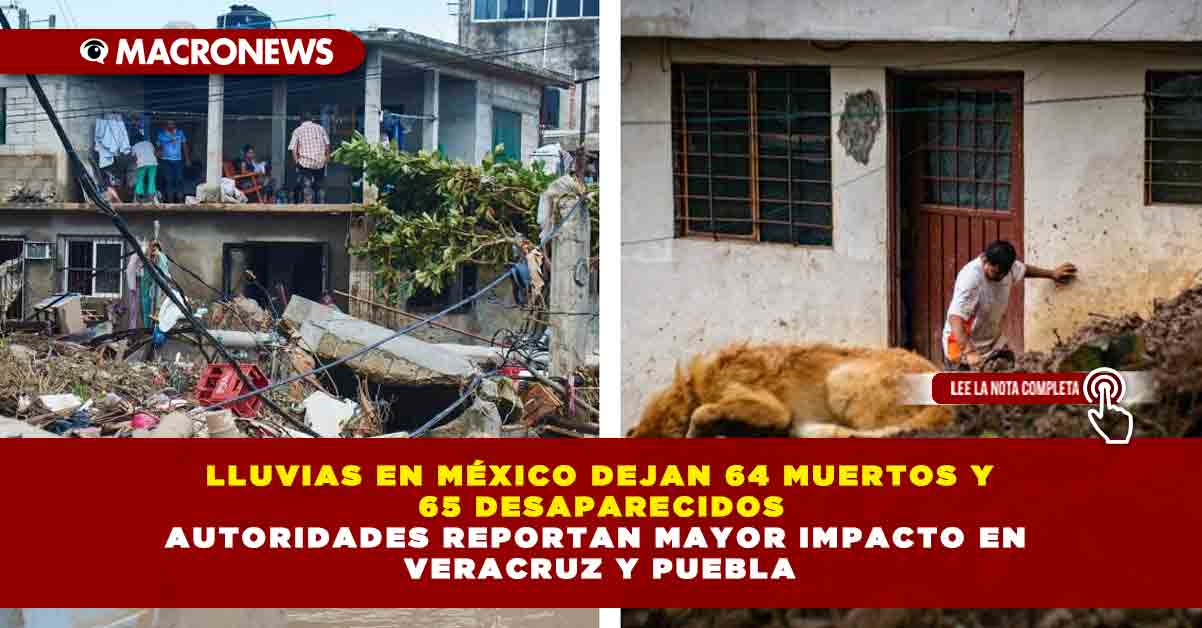 Hasta este lunes, la cifra de personas que murieron debido a las fuertes lluvias registradas en varios estados de México, se elevó a 64, siendo Veracruz el que más decesos ha registrado. De acuerdo con datos de las autoridades, el total de desaparecidos es de 65 hasta el momento.