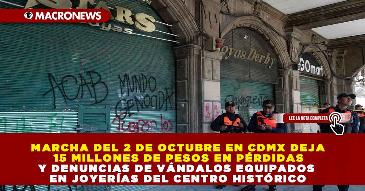 En Ciudad de México (CDMX), empresarios de más de 20 joyerías afectadas estiman pérdidas de, por lo menos, 15 millones de pesos, debido al vandalismo y robo de joyas perpetrados por encapuchados durante la marcha del 2 de octubre, con motivo de la conmemoración de la masacre de Tlatelolco de 1968.
