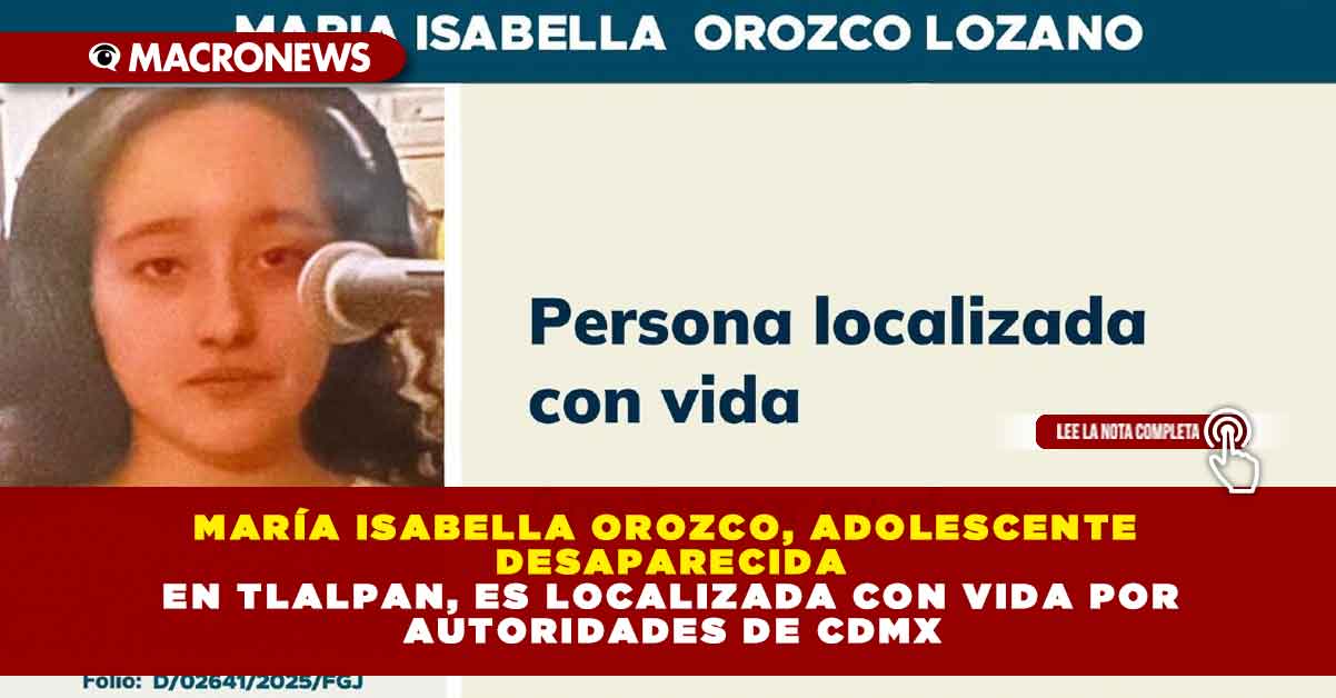 La Fiscalía General de Justicia de la Ciudad de México (FGJCDMX) informó que localizó con vida a la joven María Isabella Orozco Lozano, quien tenía un reporte de desaparición emitido el pasado 9 de septiembre.