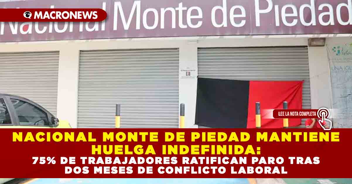 Redacción Macronews.- El Nacional Monte de Piedad (NMP) continuará en huelga indefinida, luego de que los trabajadores ratificaron su decisión de mantener el paro ante la falta de acuerdos con la parte patronal y el desarrollo de dos procesos judiciales distintos. De acuerdo con Rubén Pech Dzib, representante de los empleados en Cancún, el movimiento fue legitimado tras una votación nacional realizada los días 12, 13 y 14 de noviembre, en la que el 75% de los participantes se pronunciaron a favor de sostener la huelga.