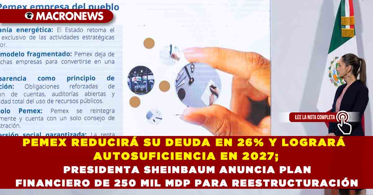 Redacción Macronews.- La presidenta de México, Claudia Sheinbaum Pardo, anunció este martes un ambicioso plan de rescate financiero para Petróleos Mexicanos (Pemex), con el objetivo de que la empresa estatal alcance su autosuficiencia operativa en 2027. Durante su conferencia matutina, la mandataria presentó la Estrategia Integral de Capitalización y Financiamiento 2025–2035, que contempla una reducción de la deuda total de Pemex —actualmente de 98,800 millones de dólares— en un 26% para el año 2030, así como la creación de un fondo de inversión por 250,000 millones de pesos para proyectos productivos.
