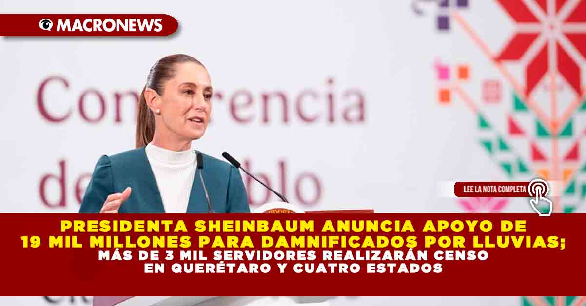 Redacción Macronews.- La presidenta de México, Claudia Sheinbaum Pardo, recorrió este lunes las zonas afectadas por las lluvias en la Sierra Gorda de Querétaro, donde anunció un censo nacional para entregar apoyos económicos a damnificados en cinco entidades. Desde el municipio de Pinal de Amoles, uno de los más golpeados por las precipitaciones, la mandataria federal confirmó que su gobierno destinará una bolsa de 19 mil millones de pesos para atender a las familias afectadas en Querétaro, Veracruz, Puebla, Hidalgo y San Luis Potosí.
