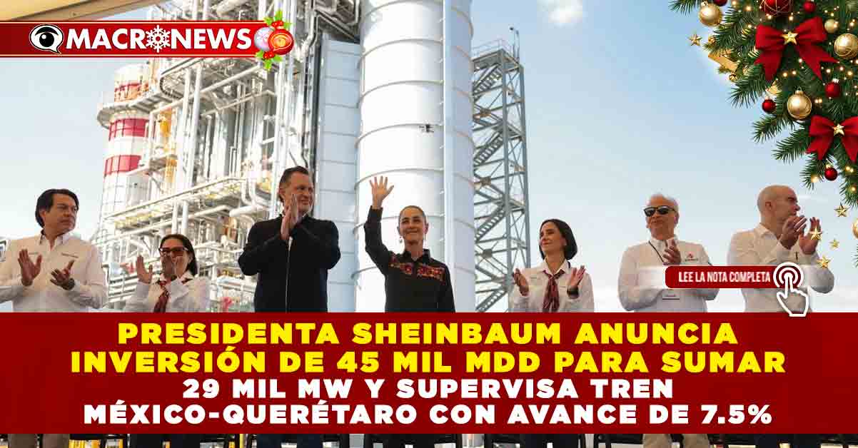 Redacción Macronews.- El gobierno federal incrementará la capacidad de generación de energía eléctrica en 29 mil megavatios a lo largo del actual sexenio, mediante una inversión conjunta pública y privada estimada en 45 mil millones de dólares, equivalentes a aproximadamente 810 mil millones de pesos, informó la presidenta Claudia Sheinbaum Pardo durante la inauguración de la Central de Ciclo Combinado de la Comisión Federal de Electricidad (CFE) en Pedro Escobedo, Querétaro.