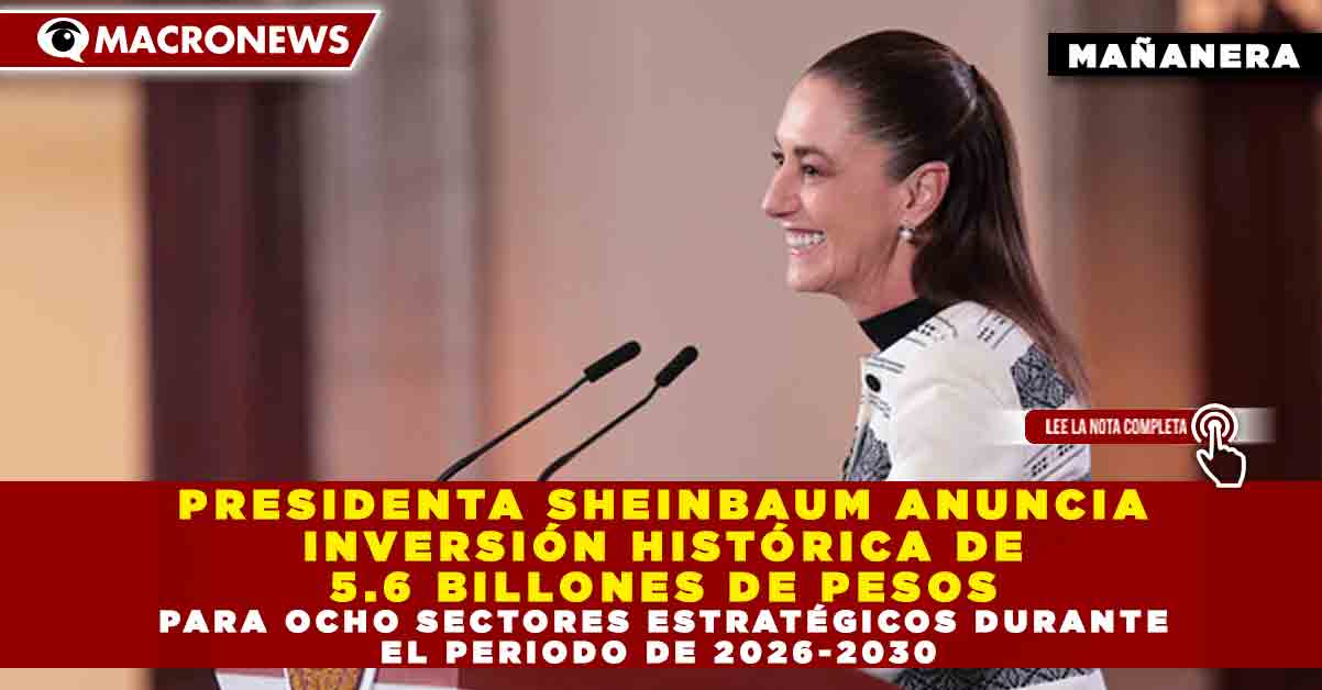 Redacción Macronews.- La presidenta de México, Claudia Sheinbaum Pardo, presentó el Plan de Inversión en Infraestructura para el Desarrollo con Bienestar 2026-2030, que contempla una inversión pública y mixta de 5.6 billones de pesos en sectores estratégicos como energía, trenes, carreteras, puertos, salud, agua, educación y aeropuertos. Tan sólo en 2026 se destinarán 722 mil millones de pesos adicionales al presupuesto, cifra que representa el 2 por ciento del Producto Interno Bruto (PIB).