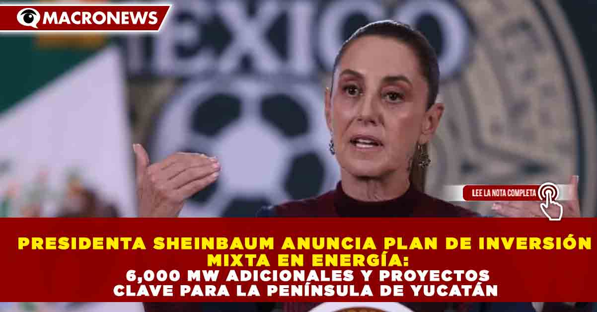 Redacción Macronews.- La presidenta de México, Claudia Sheinbaum, anunció un plan de inversión mixta en el sector energético que contempla la generación de 6,000 megawatts (MW) adicionales, con especial atención en fortalecer el suministro eléctrico en la Península de Yucatán, una de las regiones con mayor crecimiento en demanda energética del país.